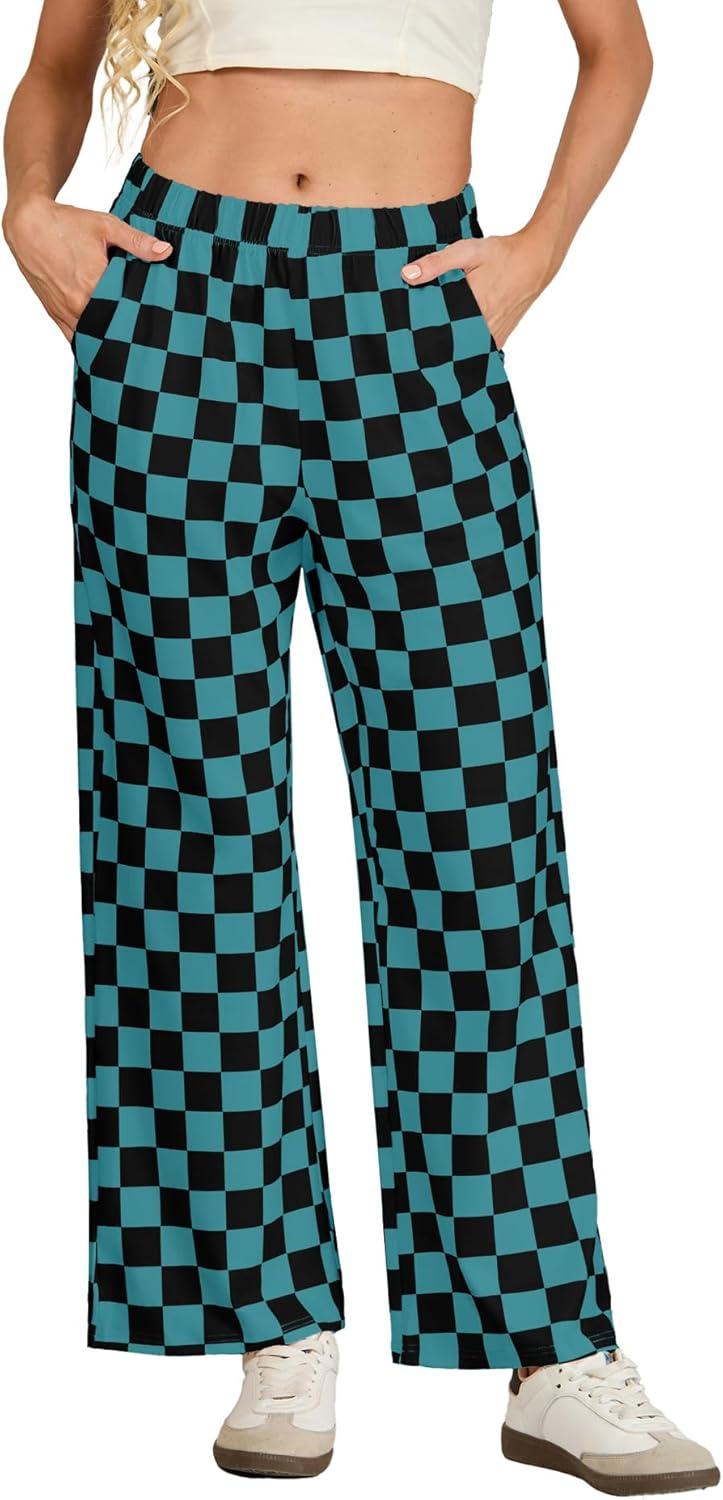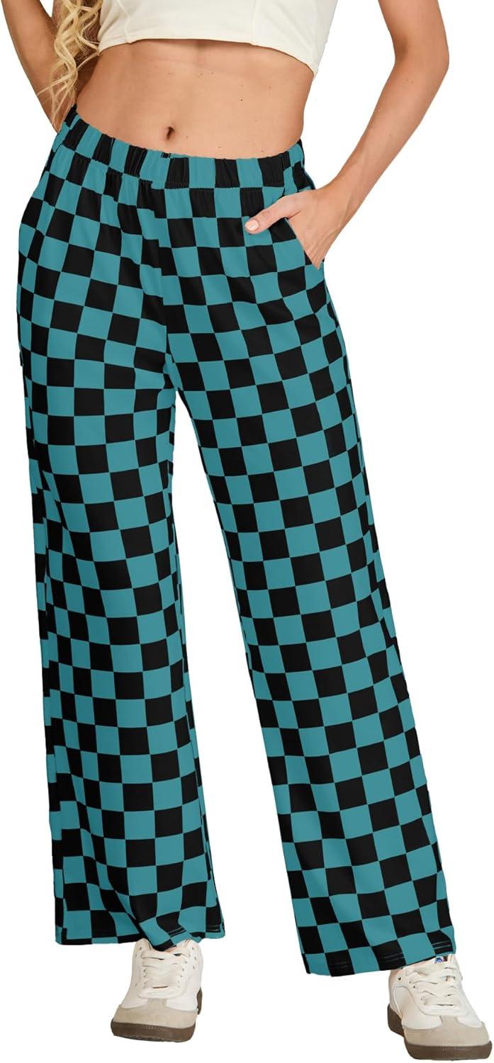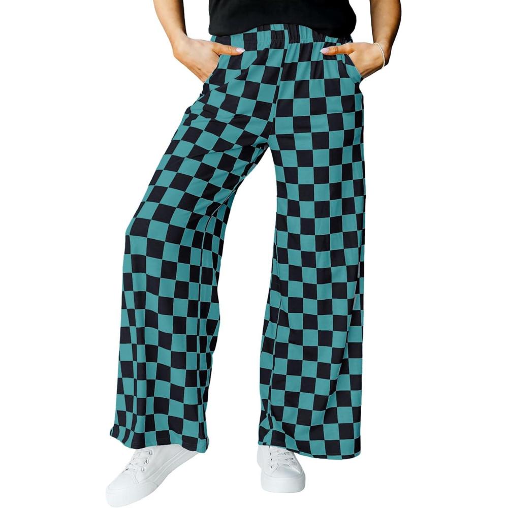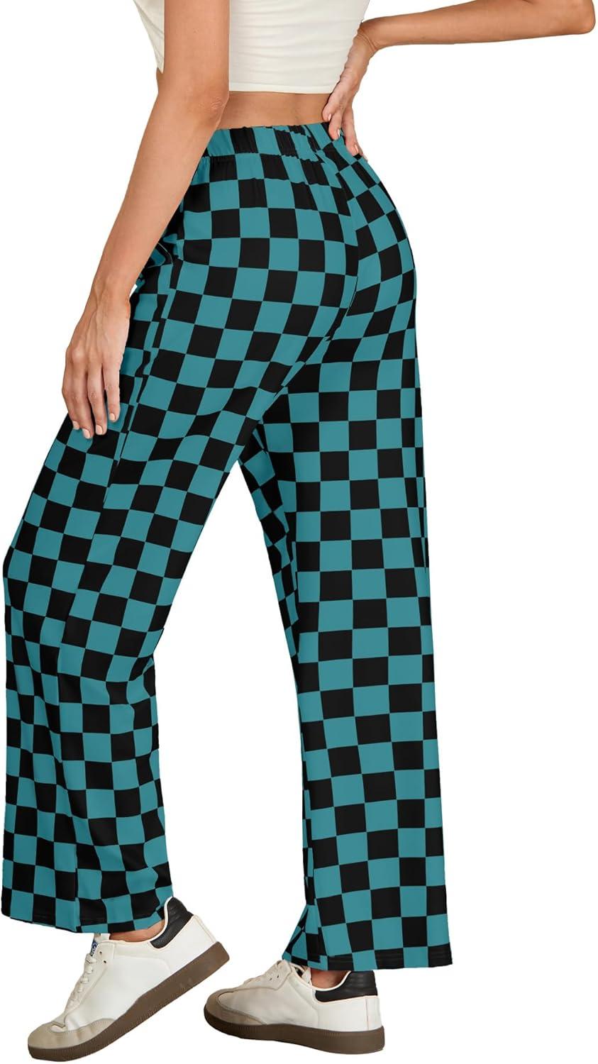 IWOLLENCE Women’s Casual Loose Checkered Wide Leg Pants High Waist Straight Lounge Y2K Gingham Trousers(Cd-black Blue Green)