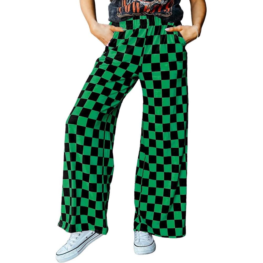 IWOLLENCE Women’s Casual Loose Checkered Wide Leg Pants High Waist Straight Lounge Y2K Gingham Trousers(Cd-black Green)