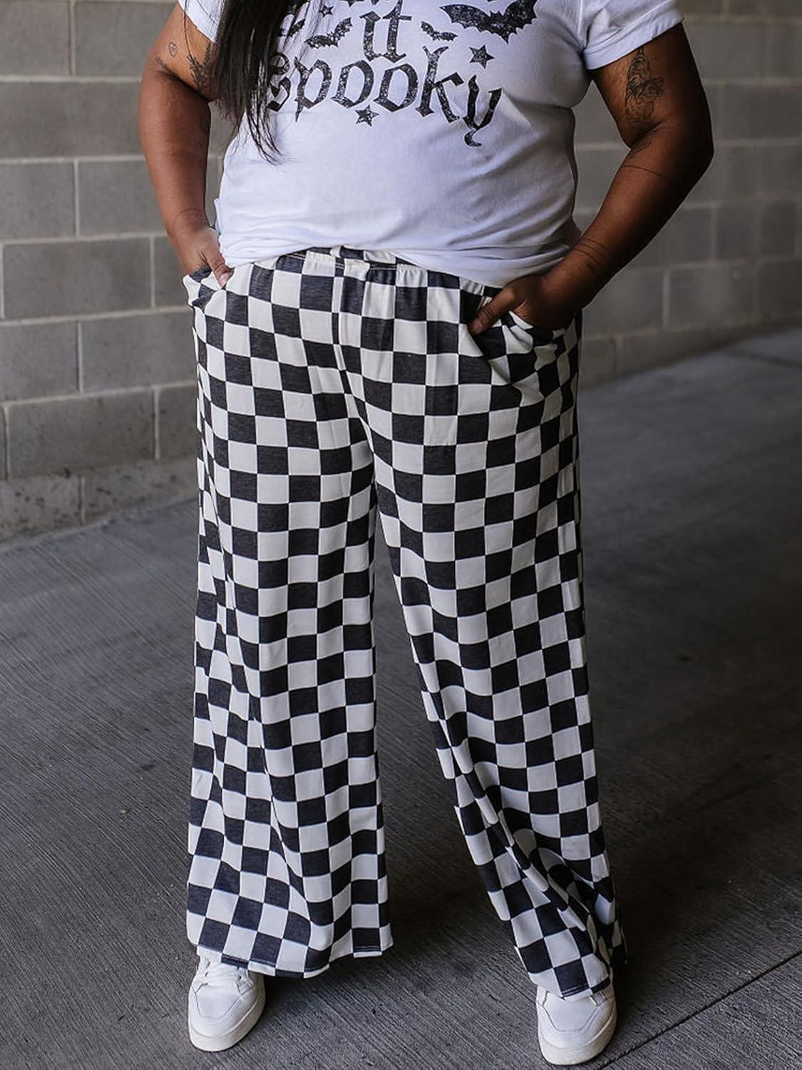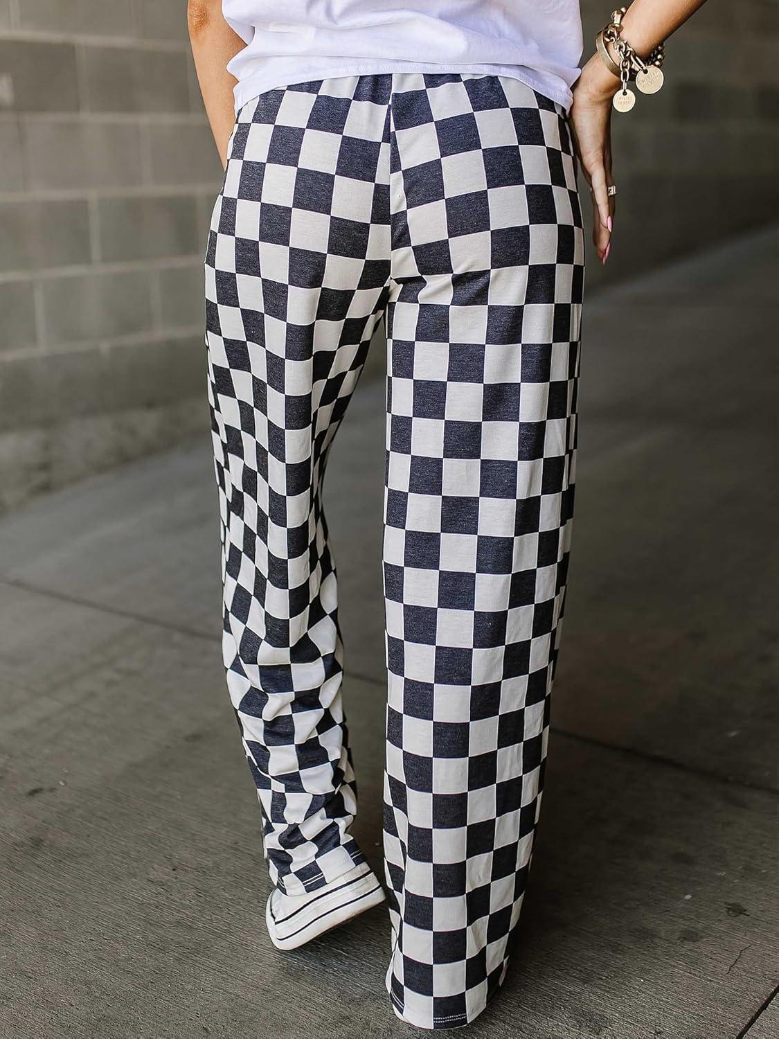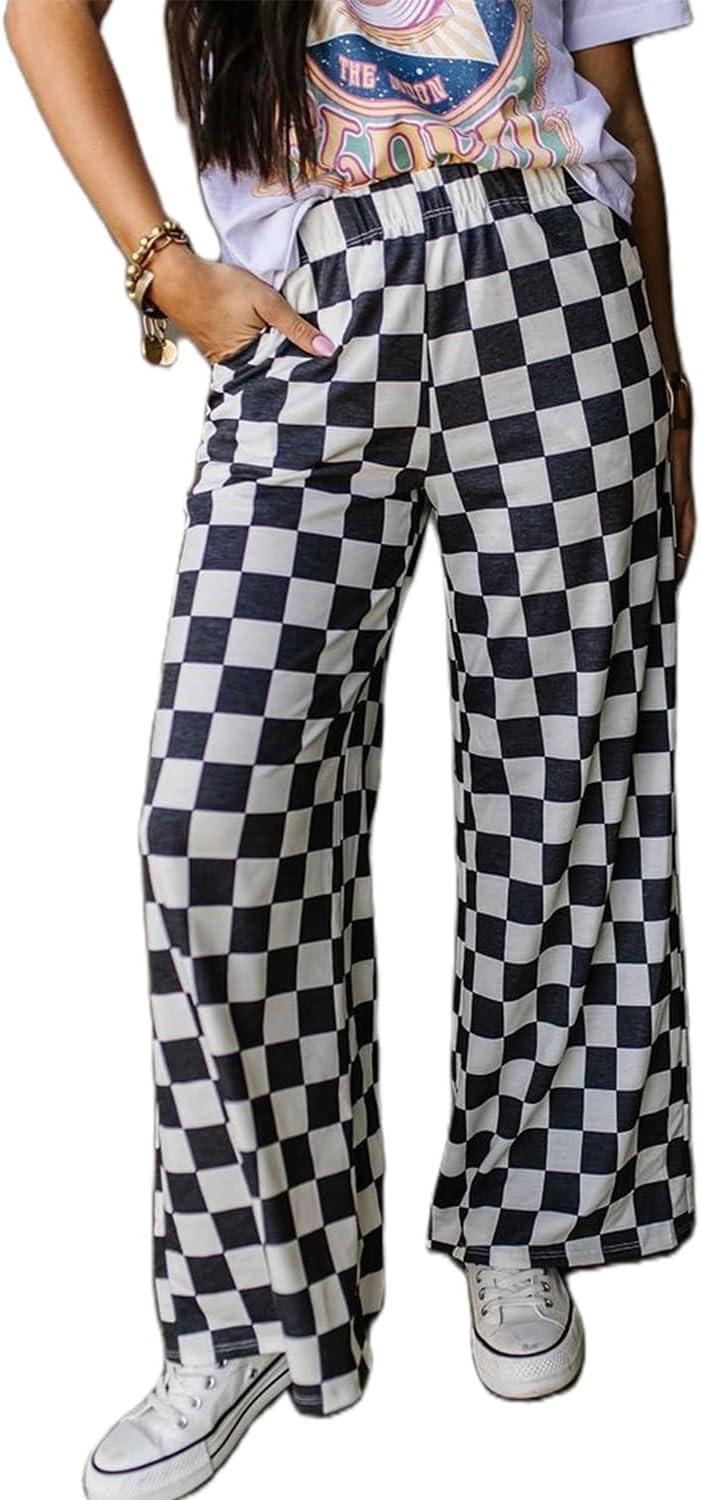 IWOLLENCE Women’s Casual Loose Checkered Wide Leg Pants High Waist Straight Lounge Y2K Gingham Trousers(Cd-black White)