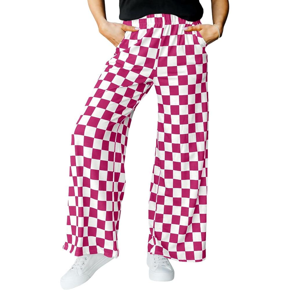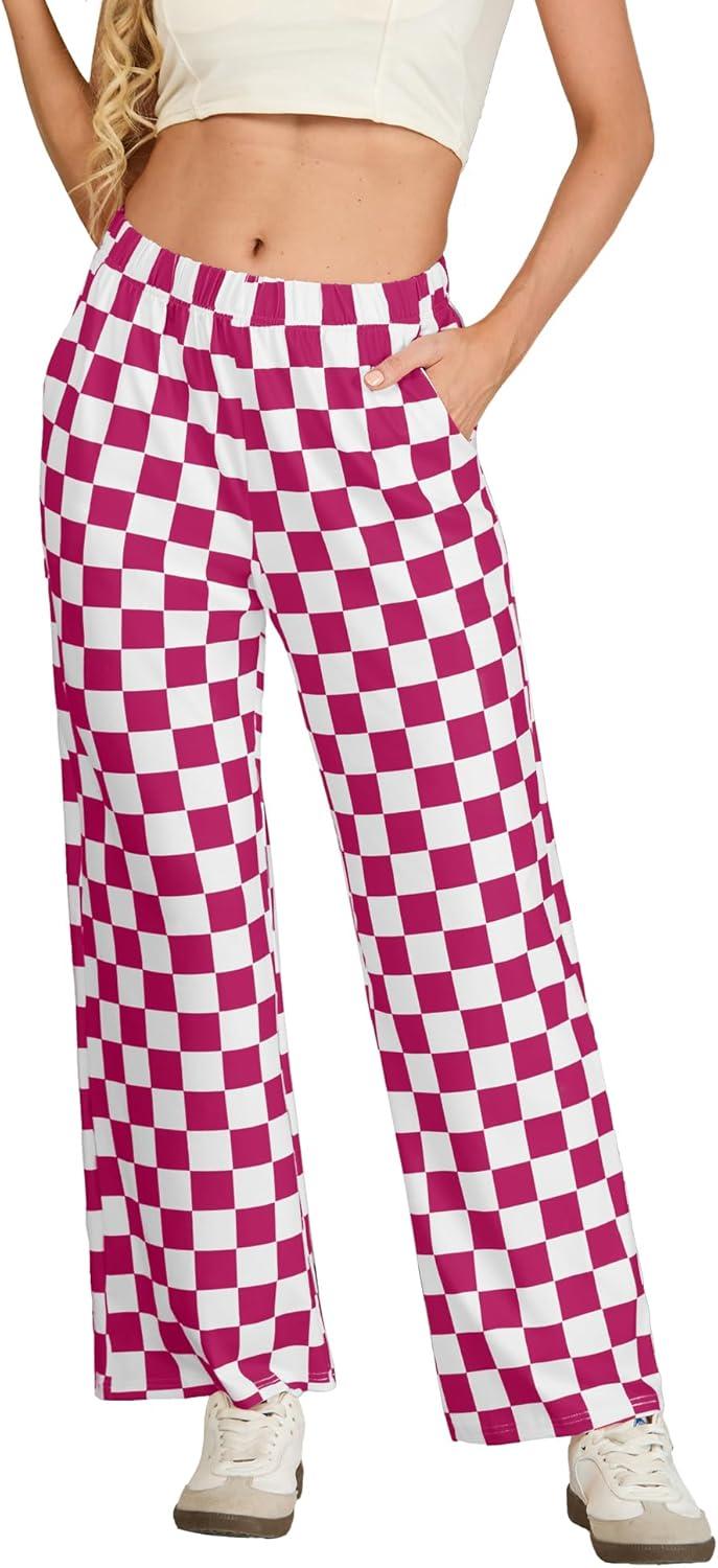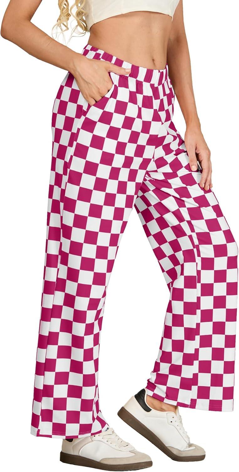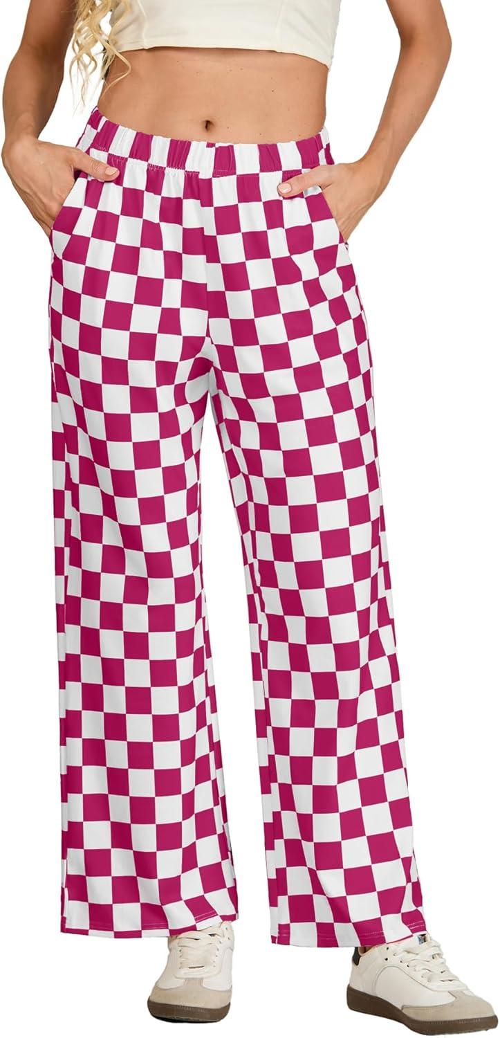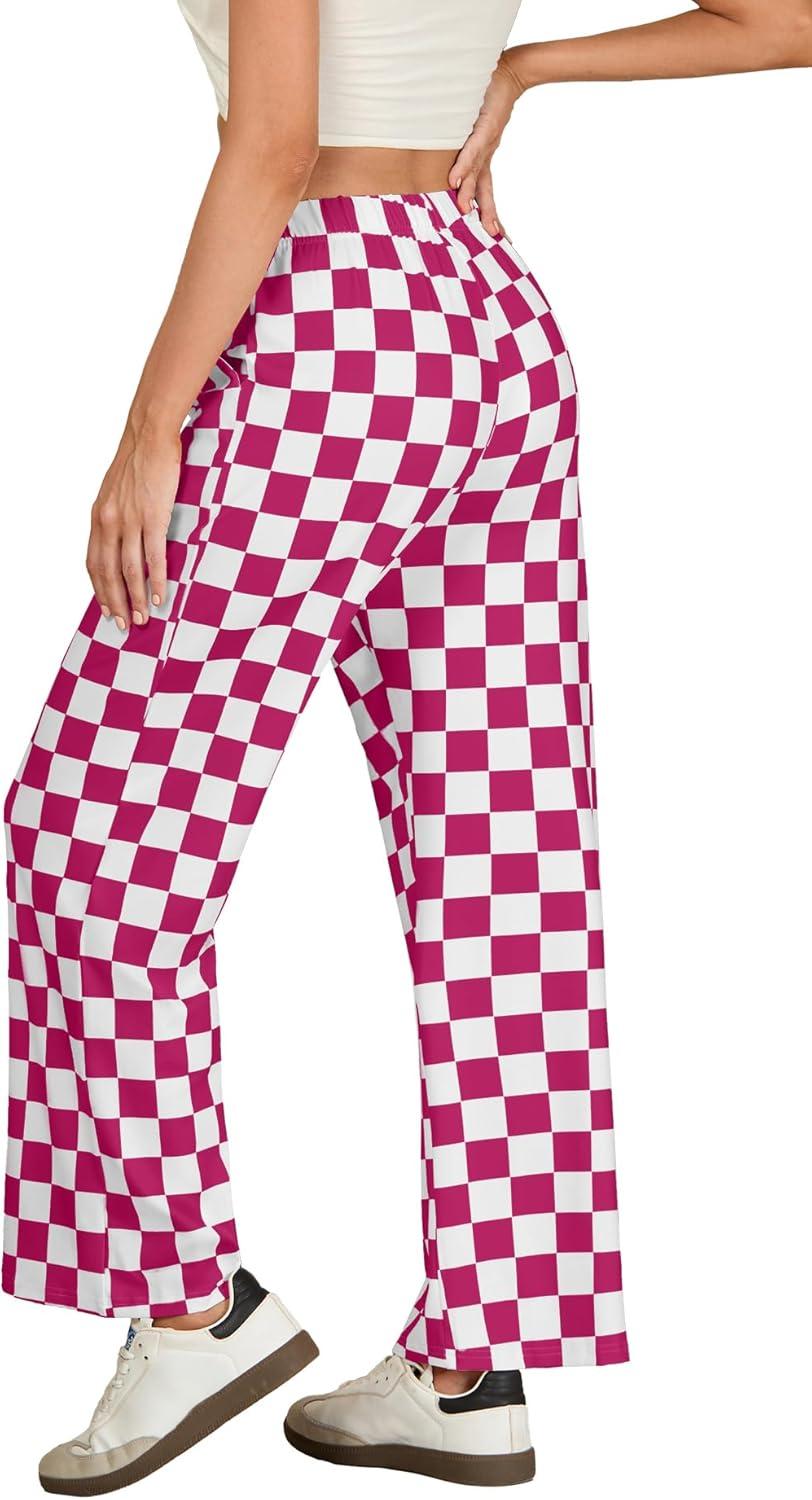 IWOLLENCE Women’s Casual Loose Checkered Wide Leg Pants High Waist Straight Lounge Y2K Gingham Trousers(Cd-dark Pink White)