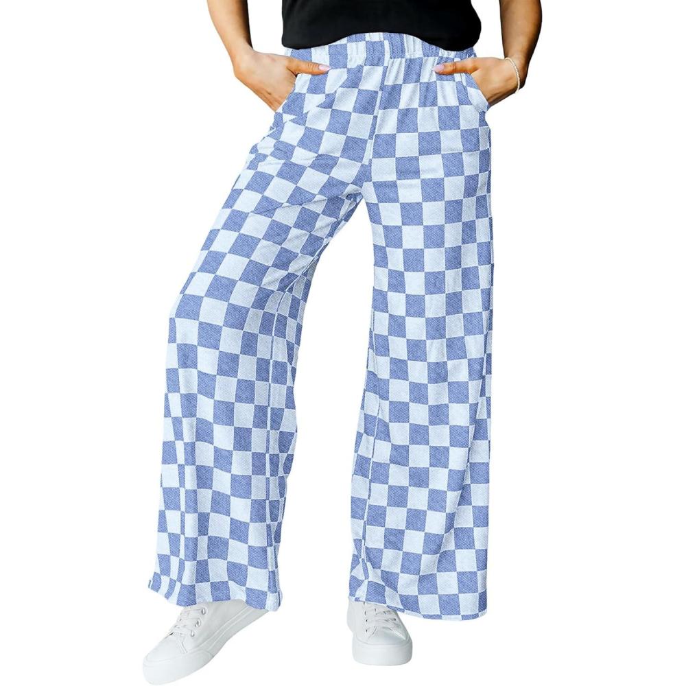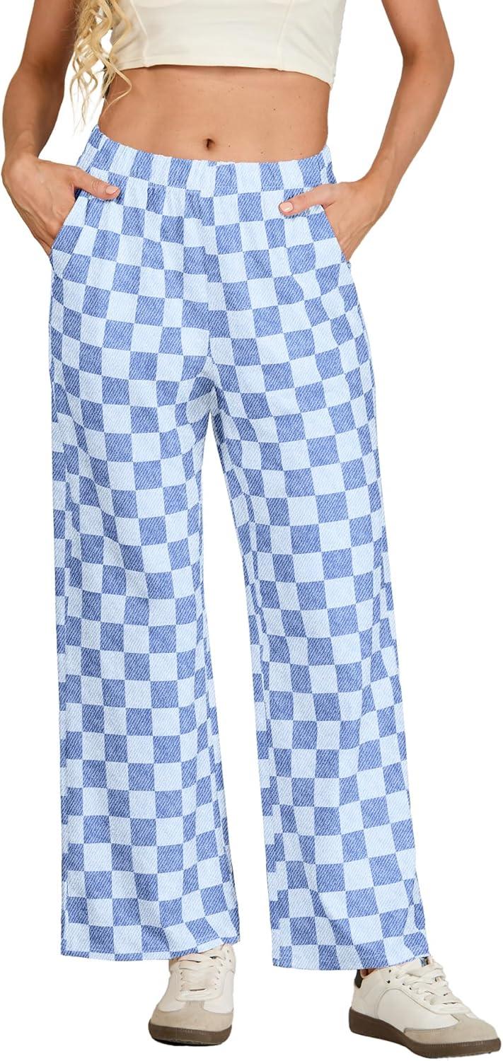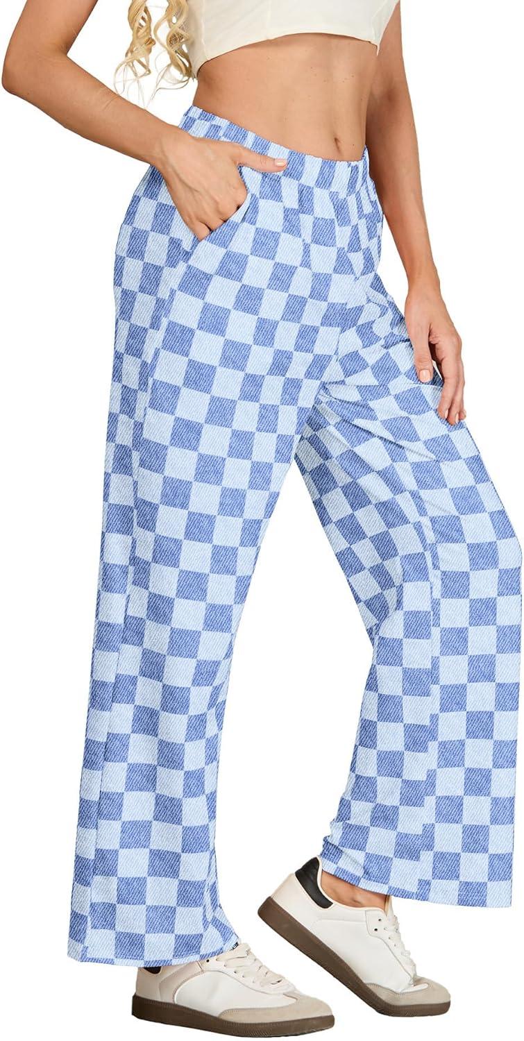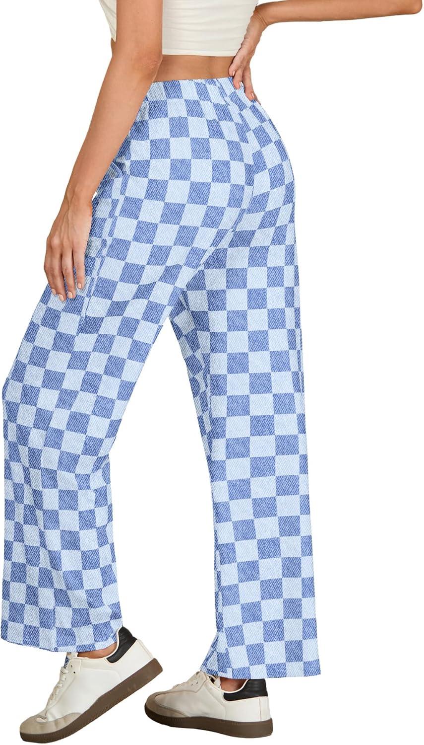 IWOLLENCE Women’s Casual Loose Checkered Wide Leg Pants High Waist Straight Lounge Y2K Gingham Trousers(Cd-denim Blue)