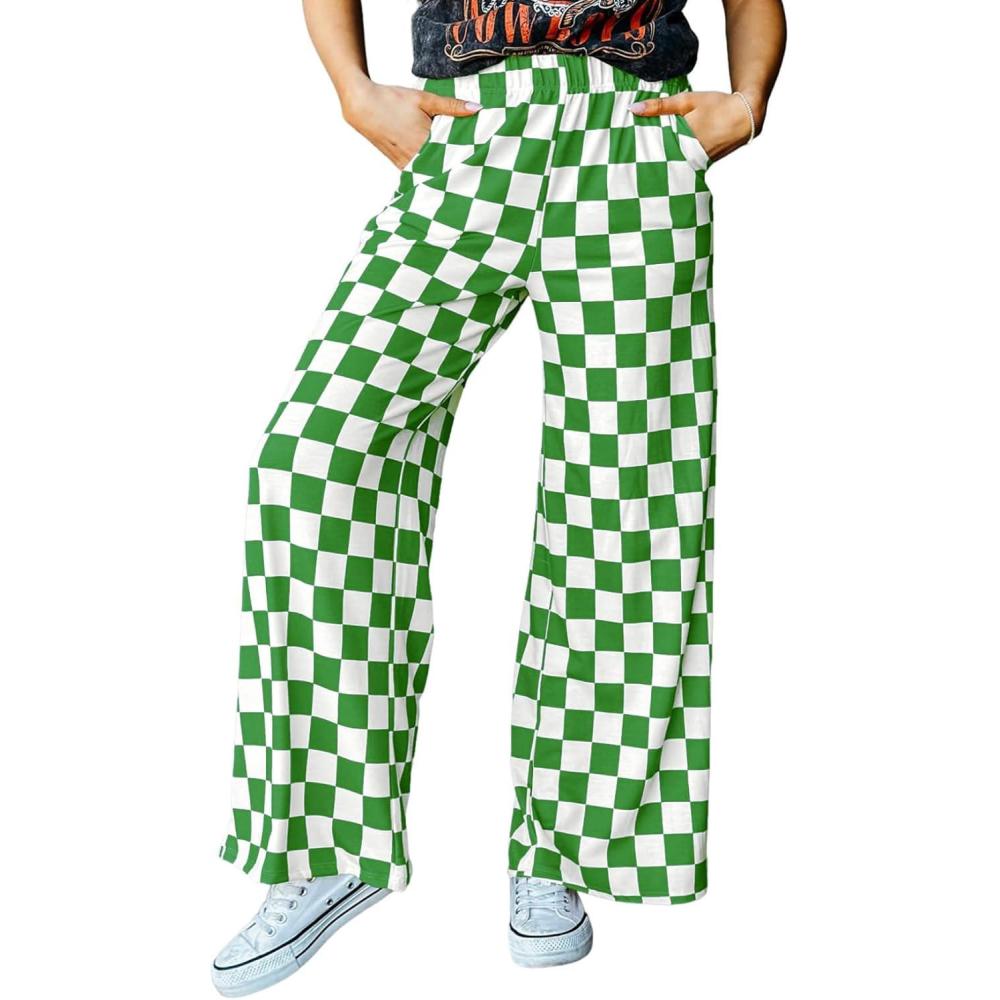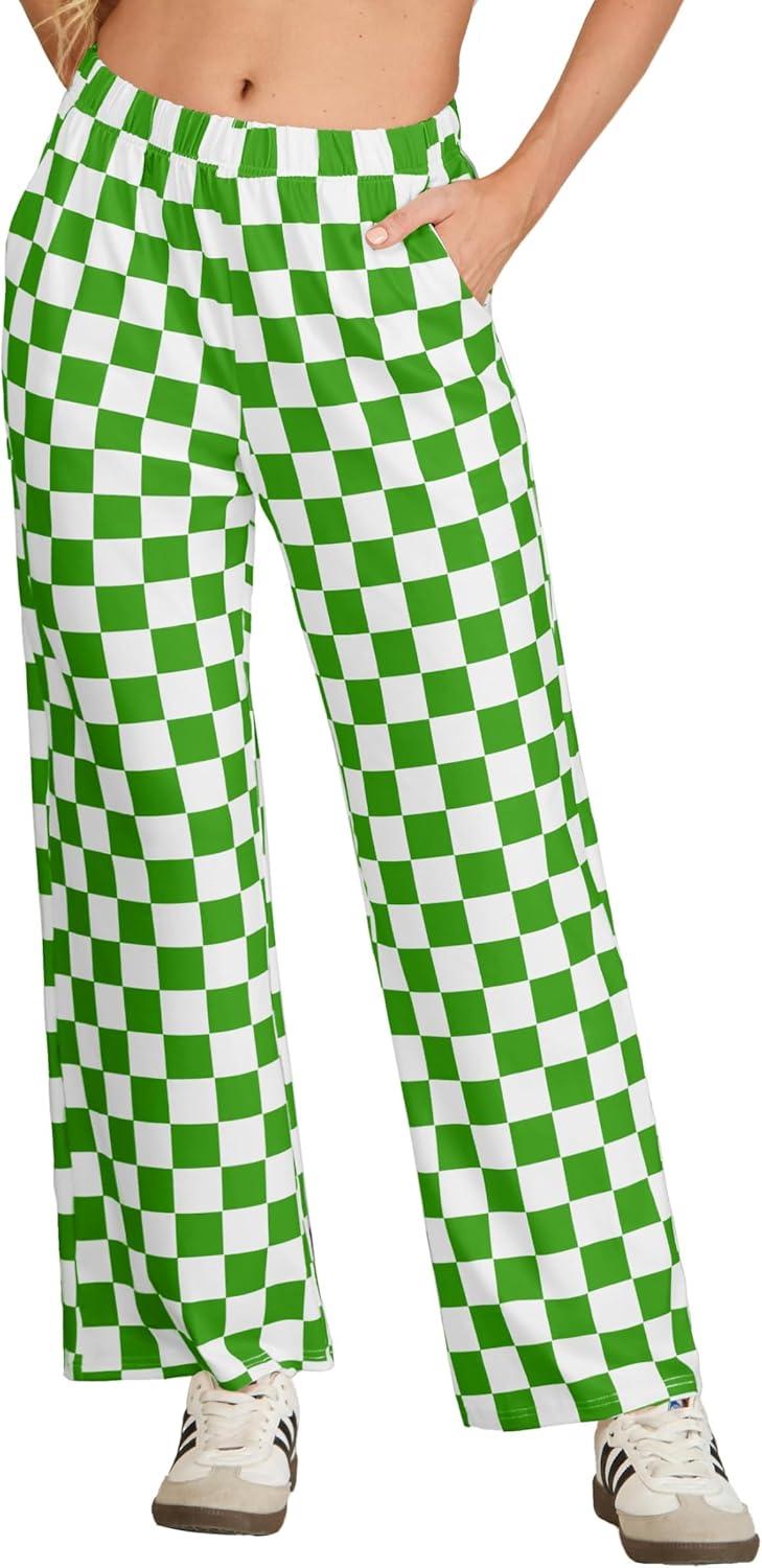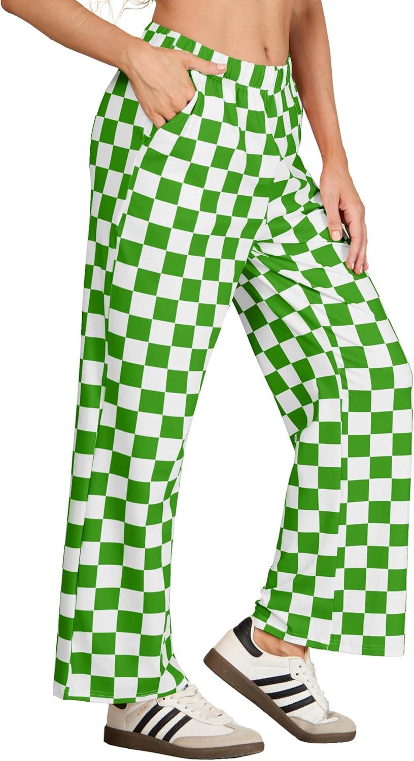 IWOLLENCE Women’s Casual Loose Checkered Wide Leg Pants High Waist Straight Lounge Y2K Gingham Trousers(Cd-green White)