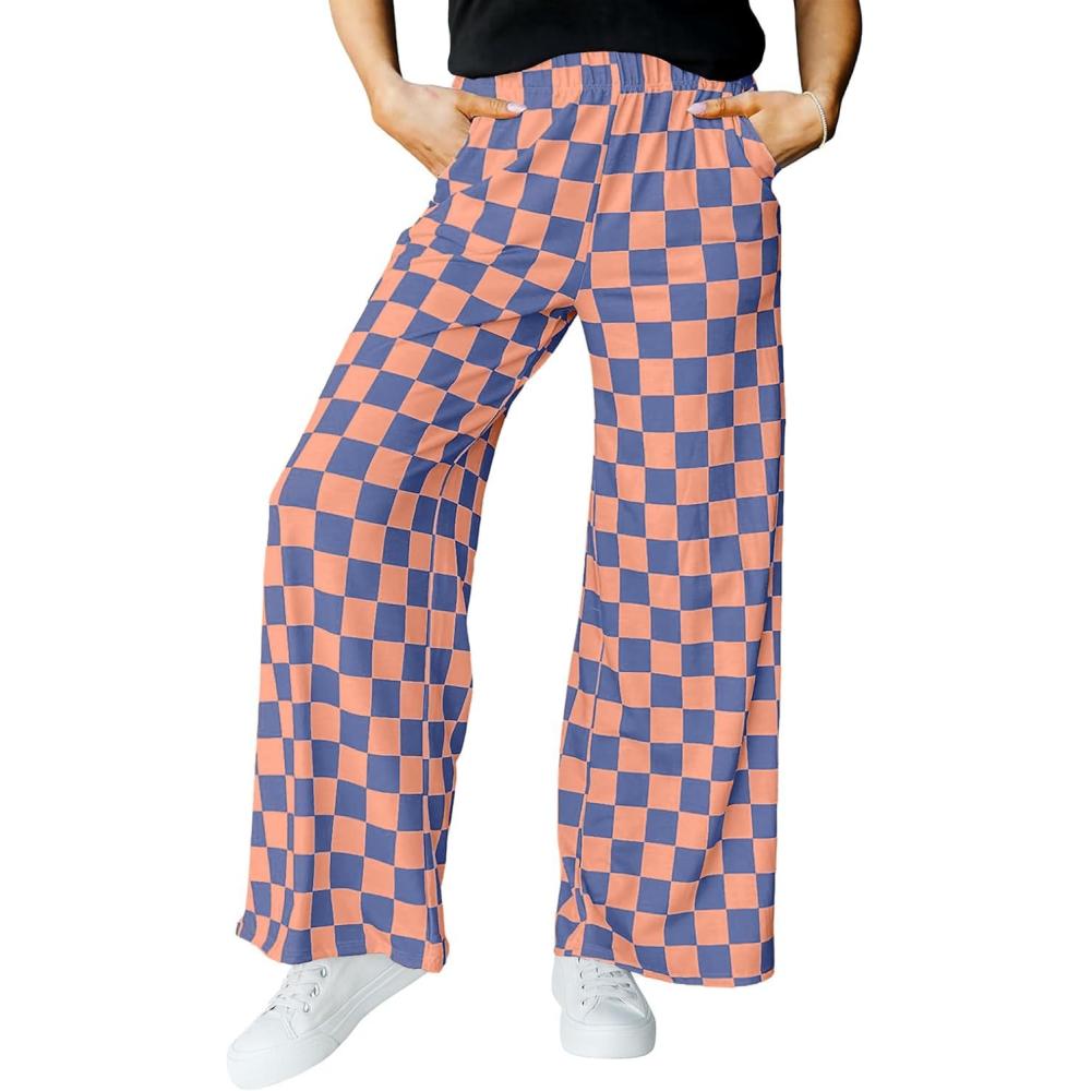 IWOLLENCE Women’s Casual Loose Checkered Wide Leg Pants High Waist Straight Lounge Y2K Gingham Trousers(Cd-orange Blue Plaid)