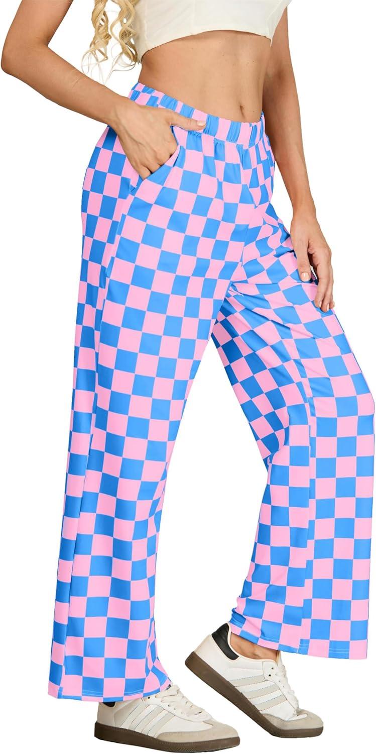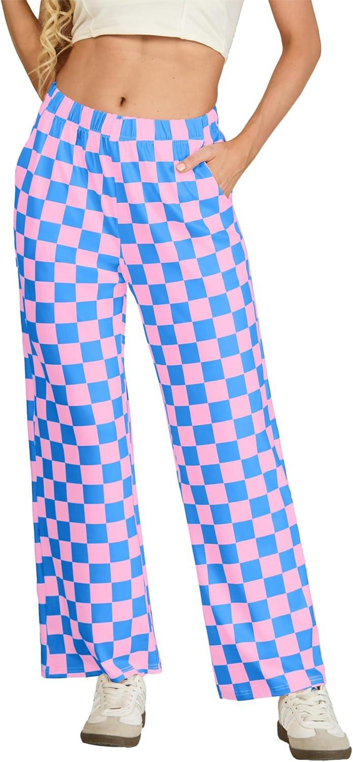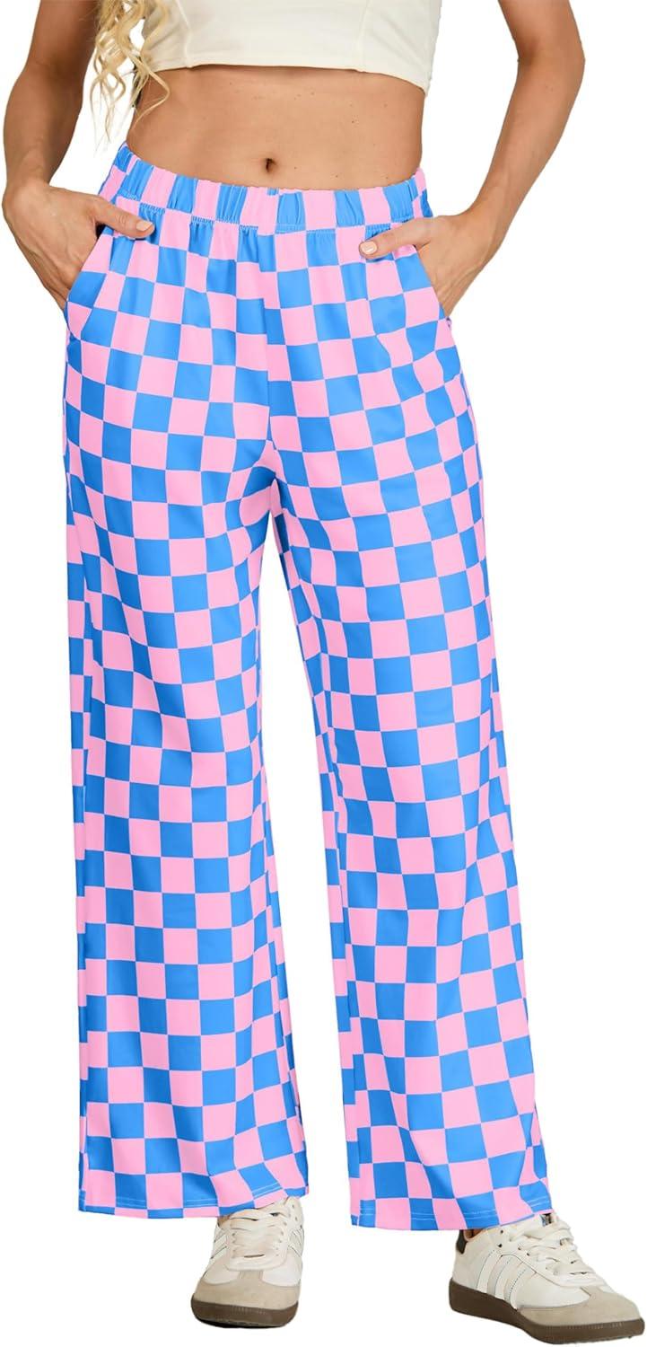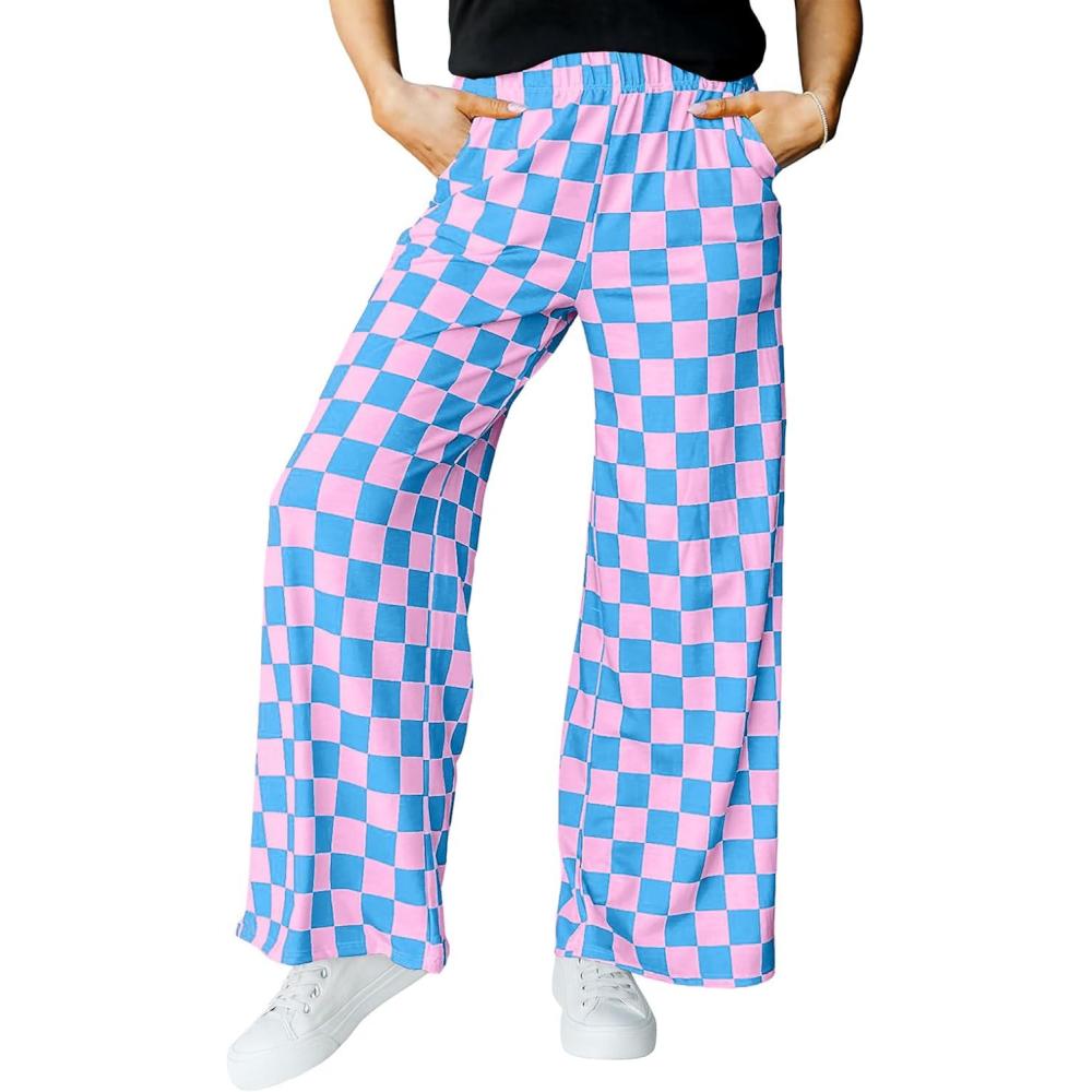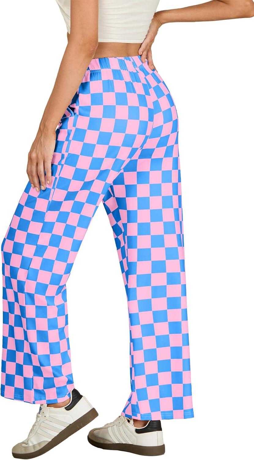 IWOLLENCE Women’s Casual Loose Checkered Wide Leg Pants High Waist Straight Lounge Y2K Gingham Trousers(Cd-pink Blue)