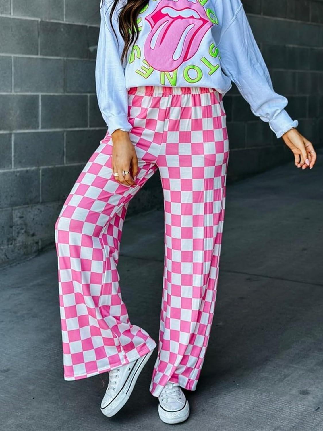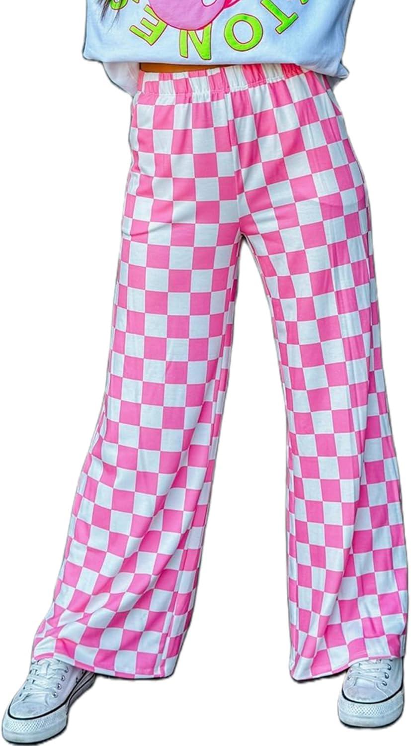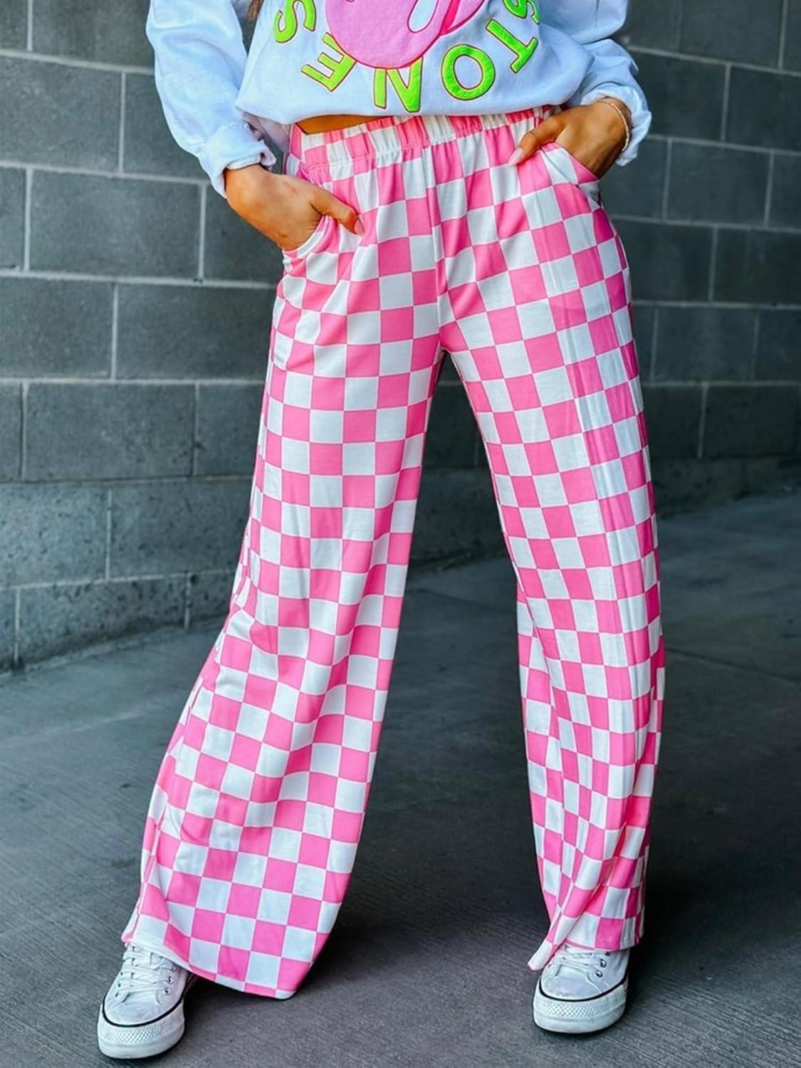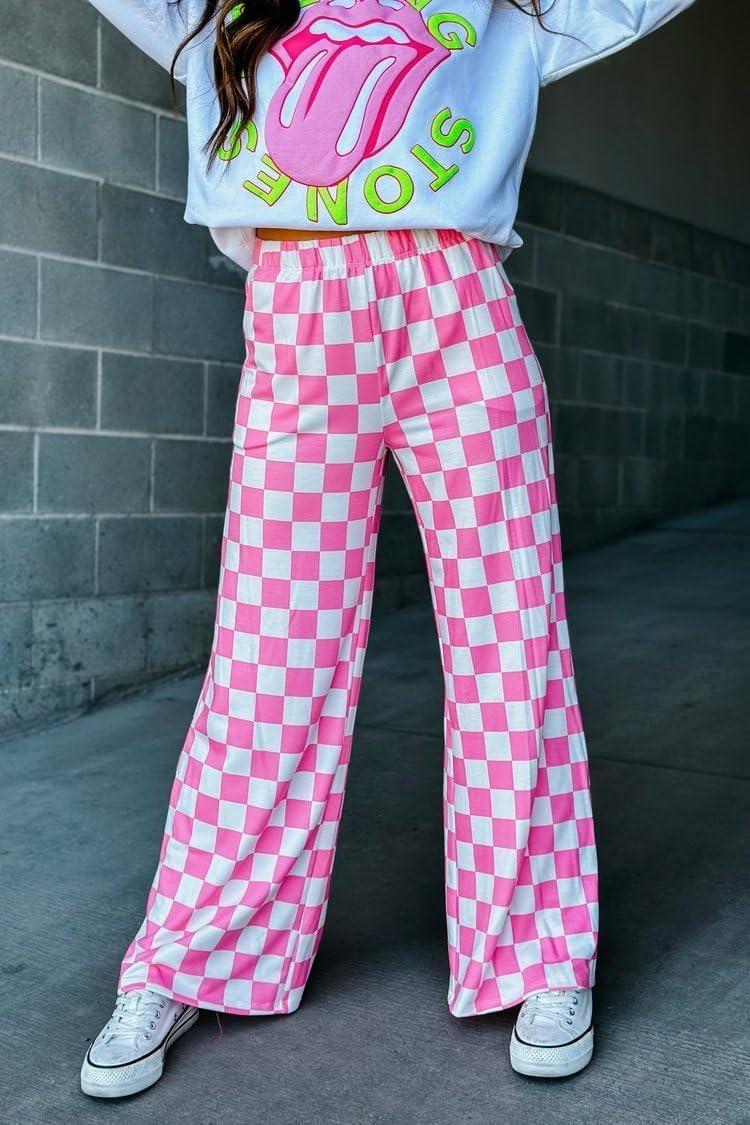 IWOLLENCE Women’s Casual Loose Checkered Wide Leg Pants High Waist Straight Lounge Y2K Gingham Trousers(Cd-pink White)