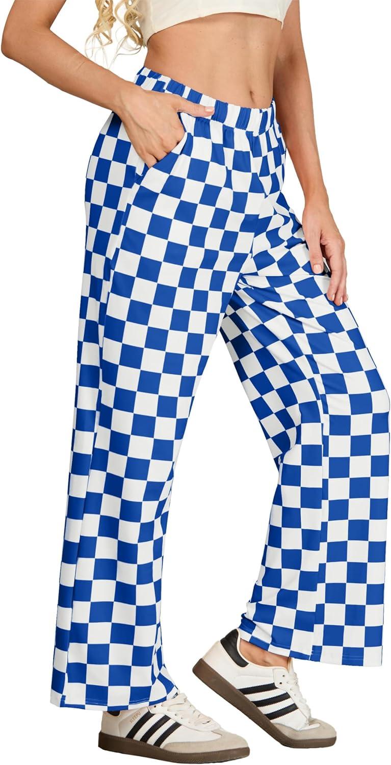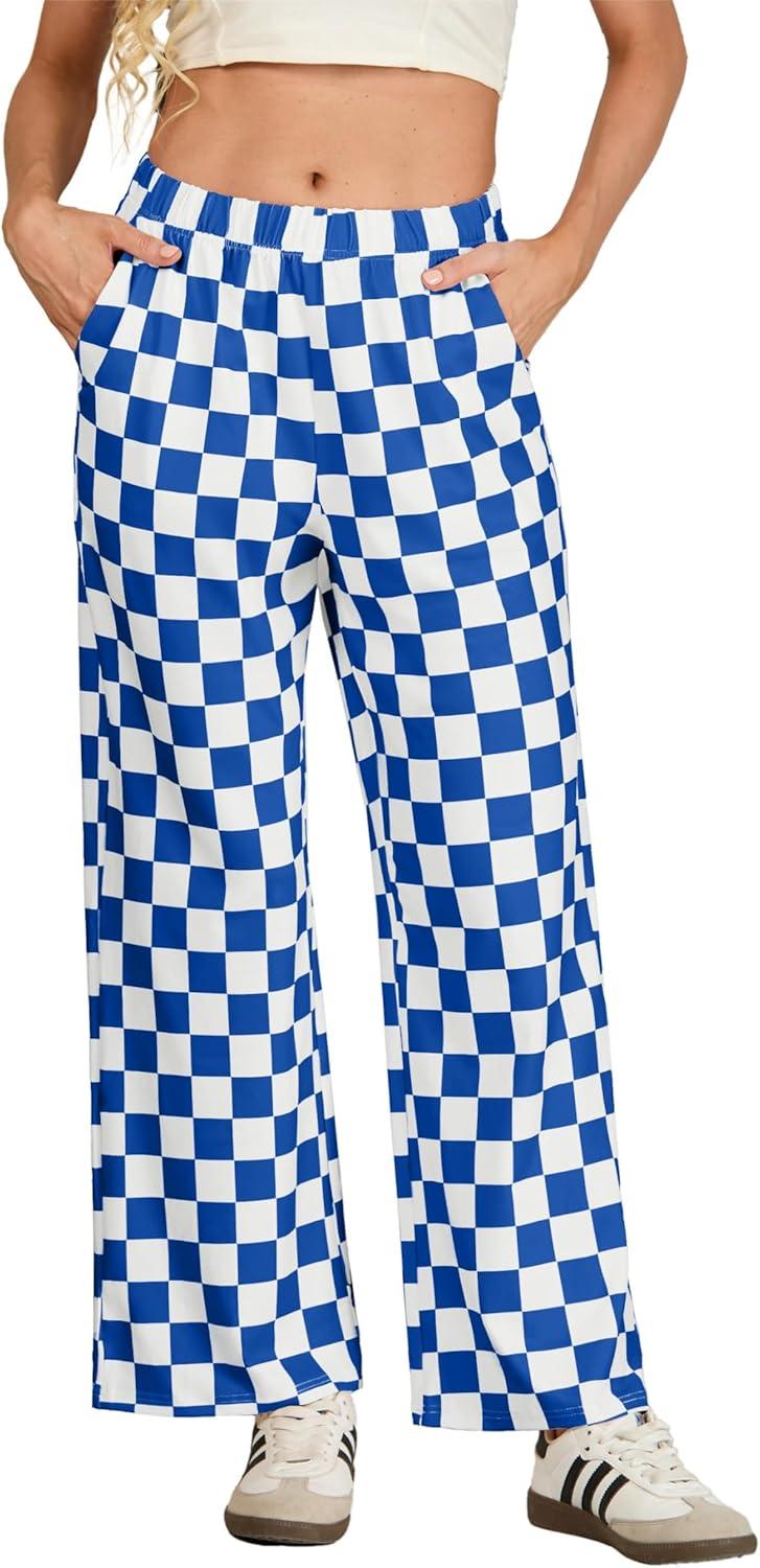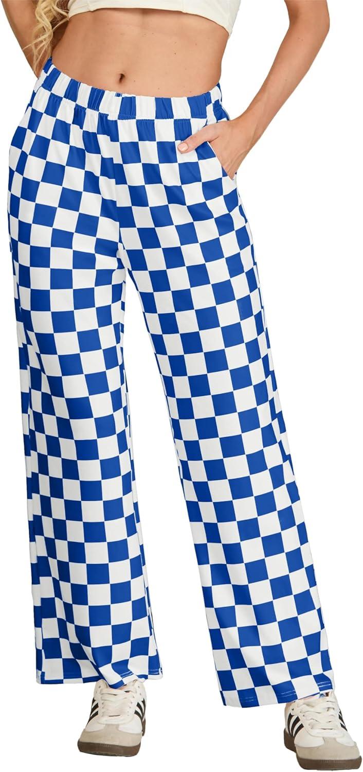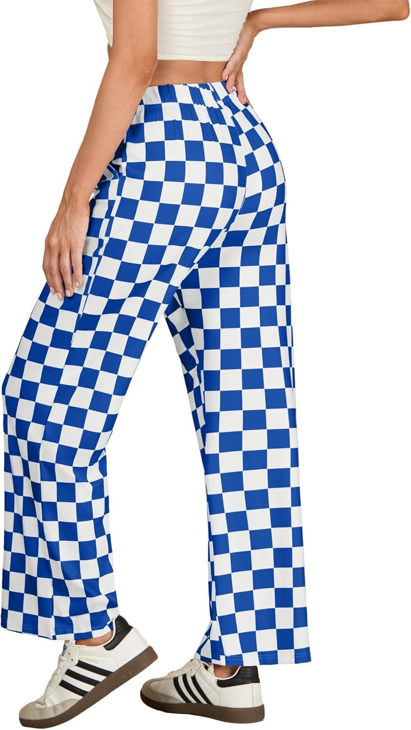 IWOLLENCE Women’s Casual Loose Checkered Wide Leg Pants High Waist Straight Lounge Y2K Gingham Trousers(Cd-royal Blue White)