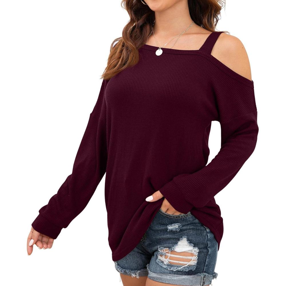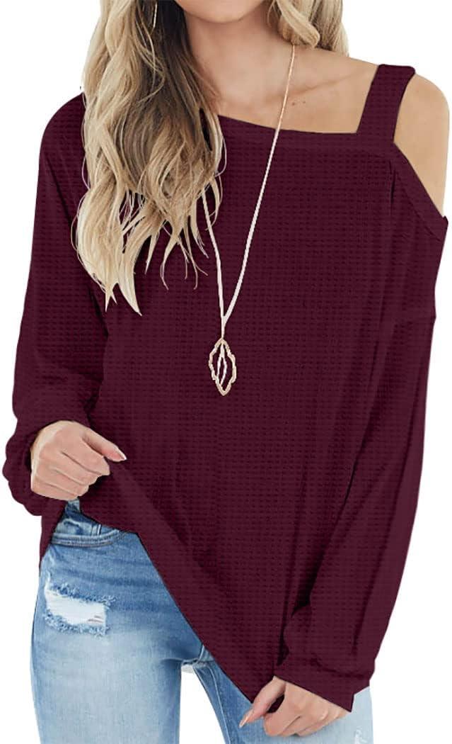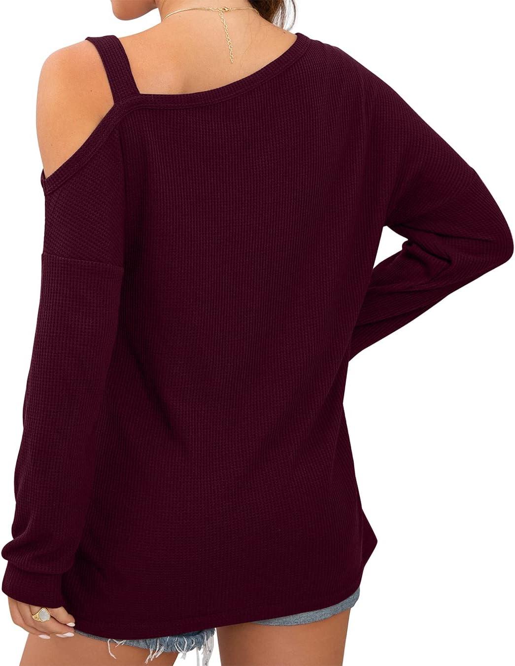 IWOLLENCE Womens Cold Shoulder Tops Long Sleeve Shirts Blouse Waffle Knit Tunic Casual Tops Loose Fit(02 Wine Red)