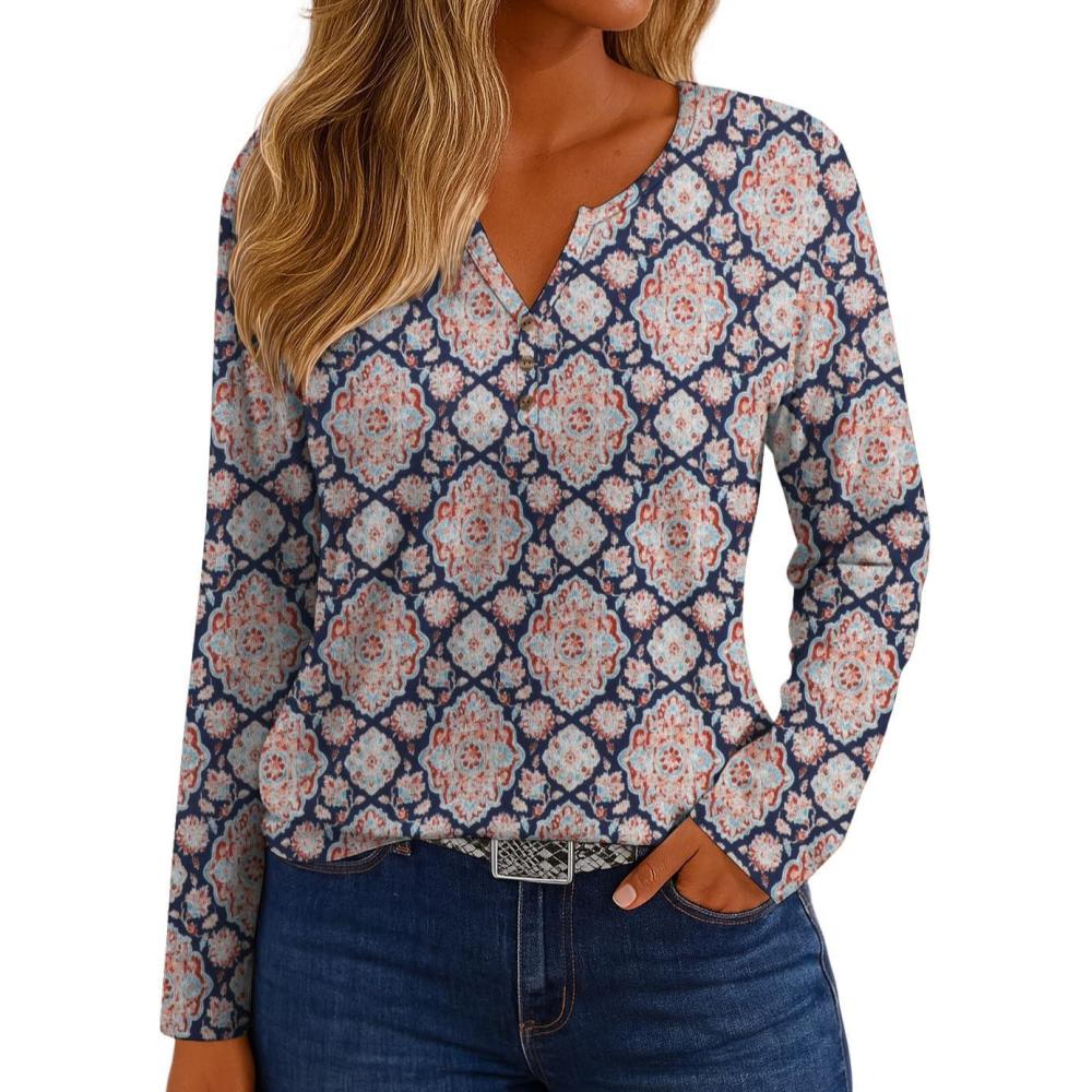 IWOLLENCE Womens Long Sleeve Aztec Western T Shirts Vintage Geometry Graphic Henley Tops Casual Button Down Blouse(Fp-diamond Daisy)