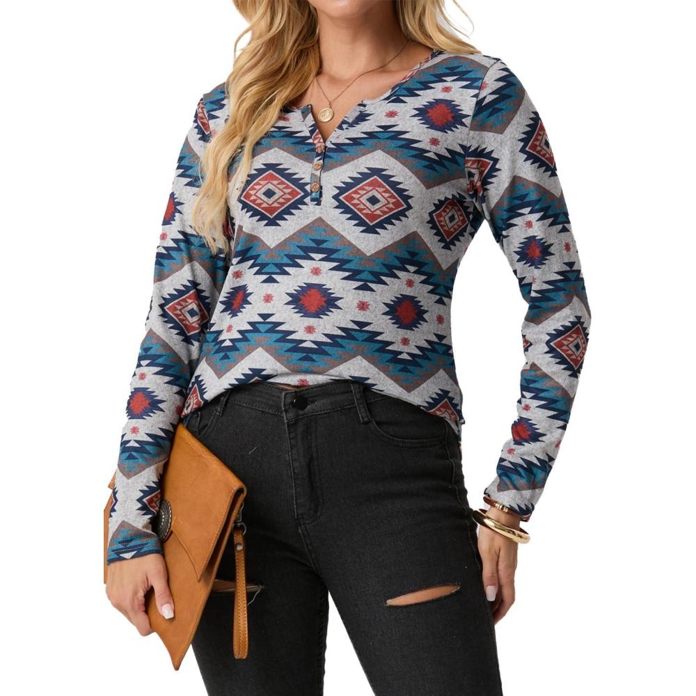 IWOLLENCE Womens Long Sleeve Aztec Western T Shirts Vintage Geometry Graphic Henley Tops Casual Button Down Blouse(Fp-white Geometry)