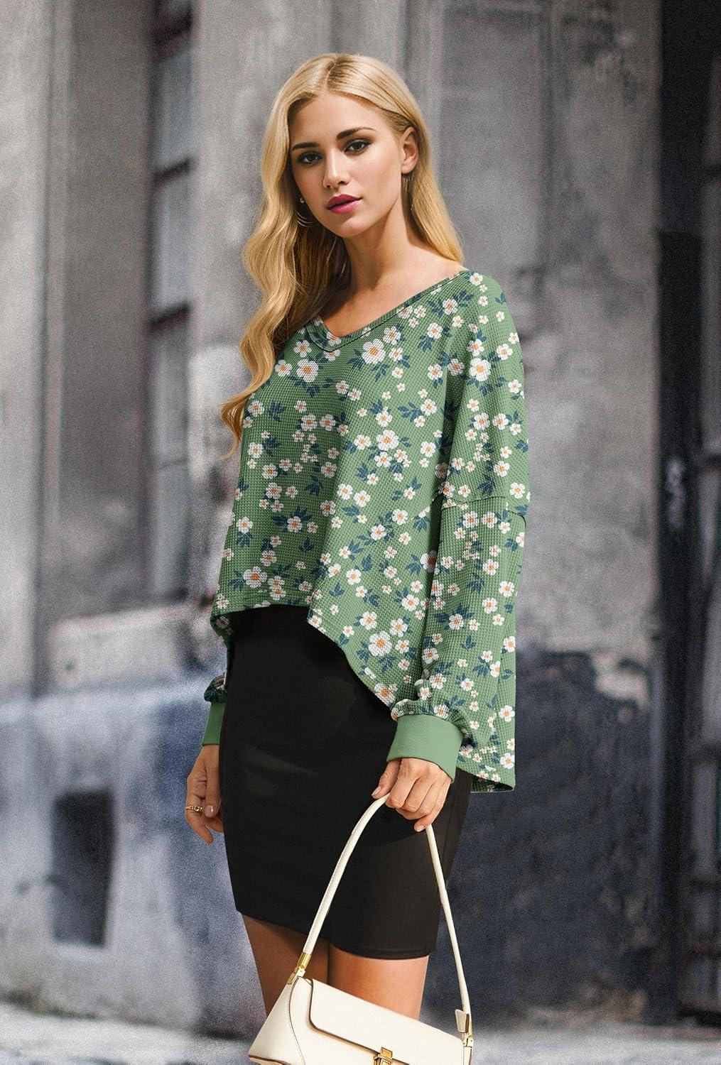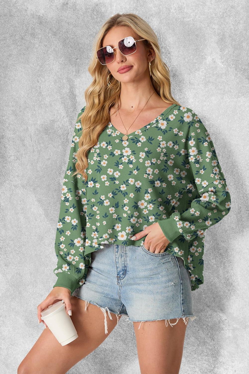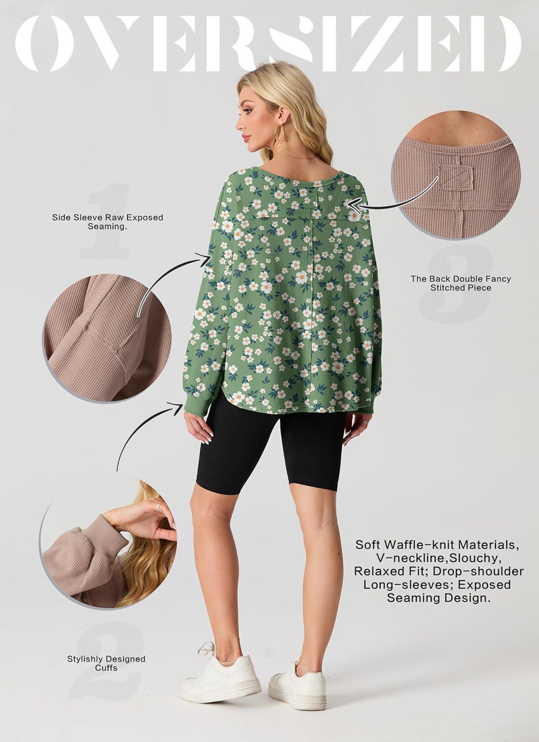 IWOLLENCE Womens Long Sleeve Shirts Oversized V Neck Tunic Tops for Women Waffle Knitted Pullover Sweater Top(35-green Sunflower)